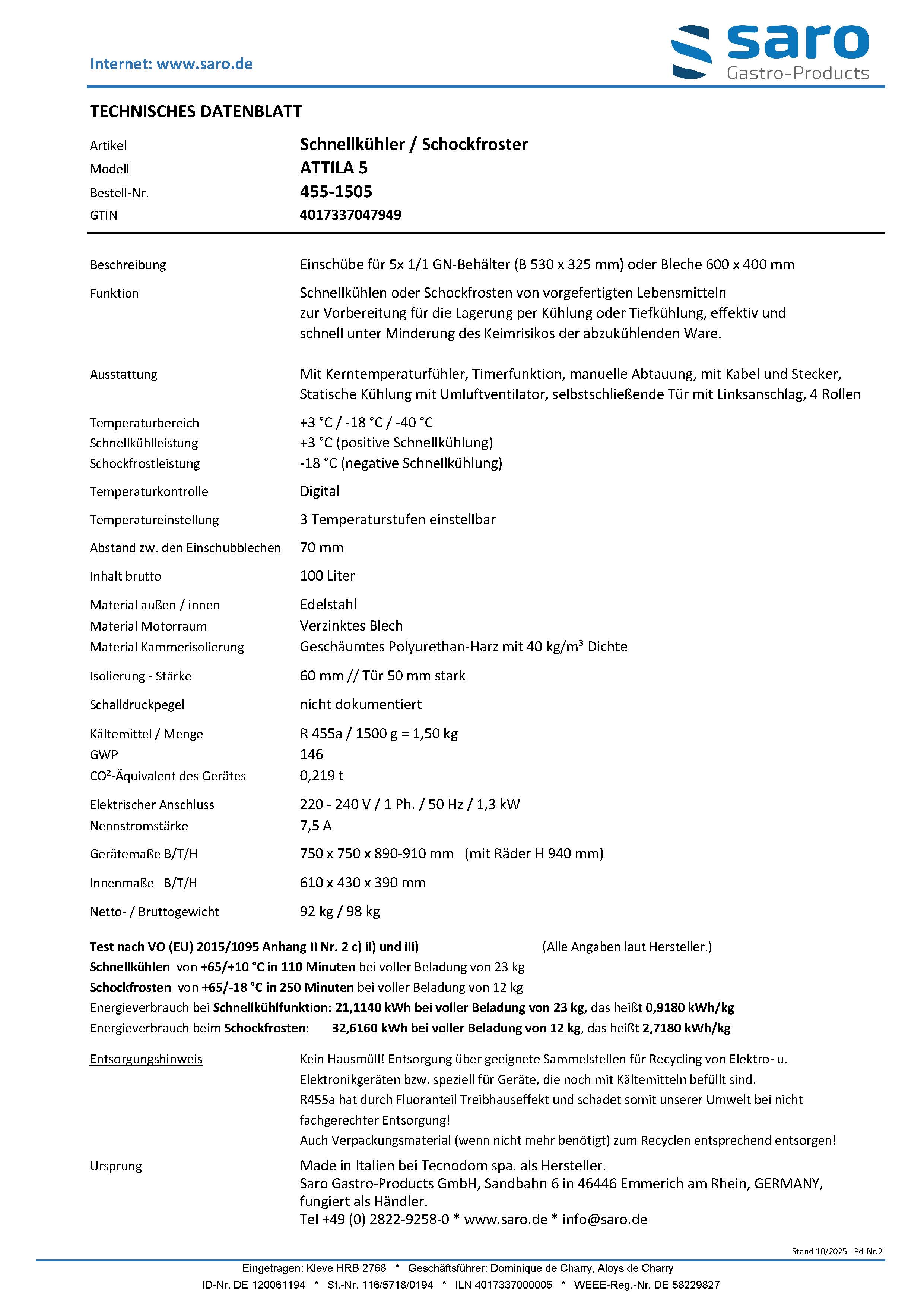 - Snelle afkoeling: van +65 °C / +10 °C in 110 minuten, maximaal draagvermogen: 23 kg